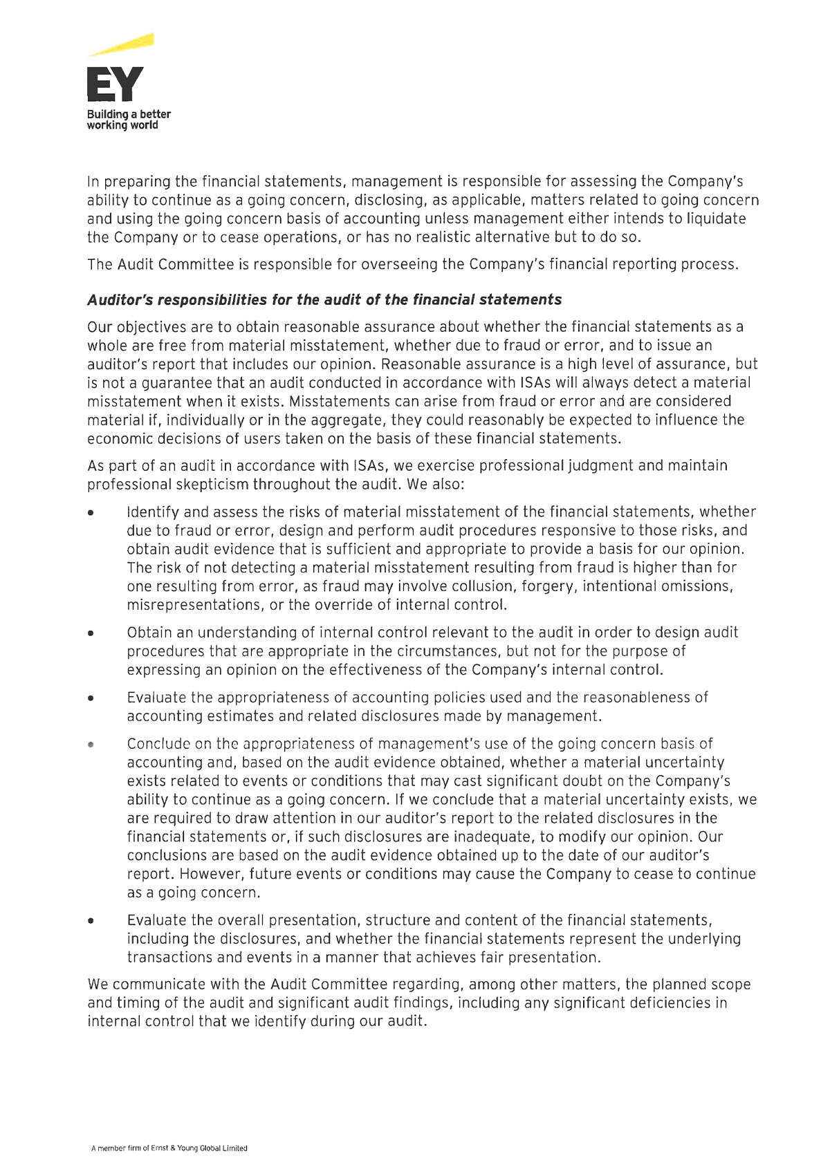 • Making an assessment of the Company’s ability to continue as a going concern.